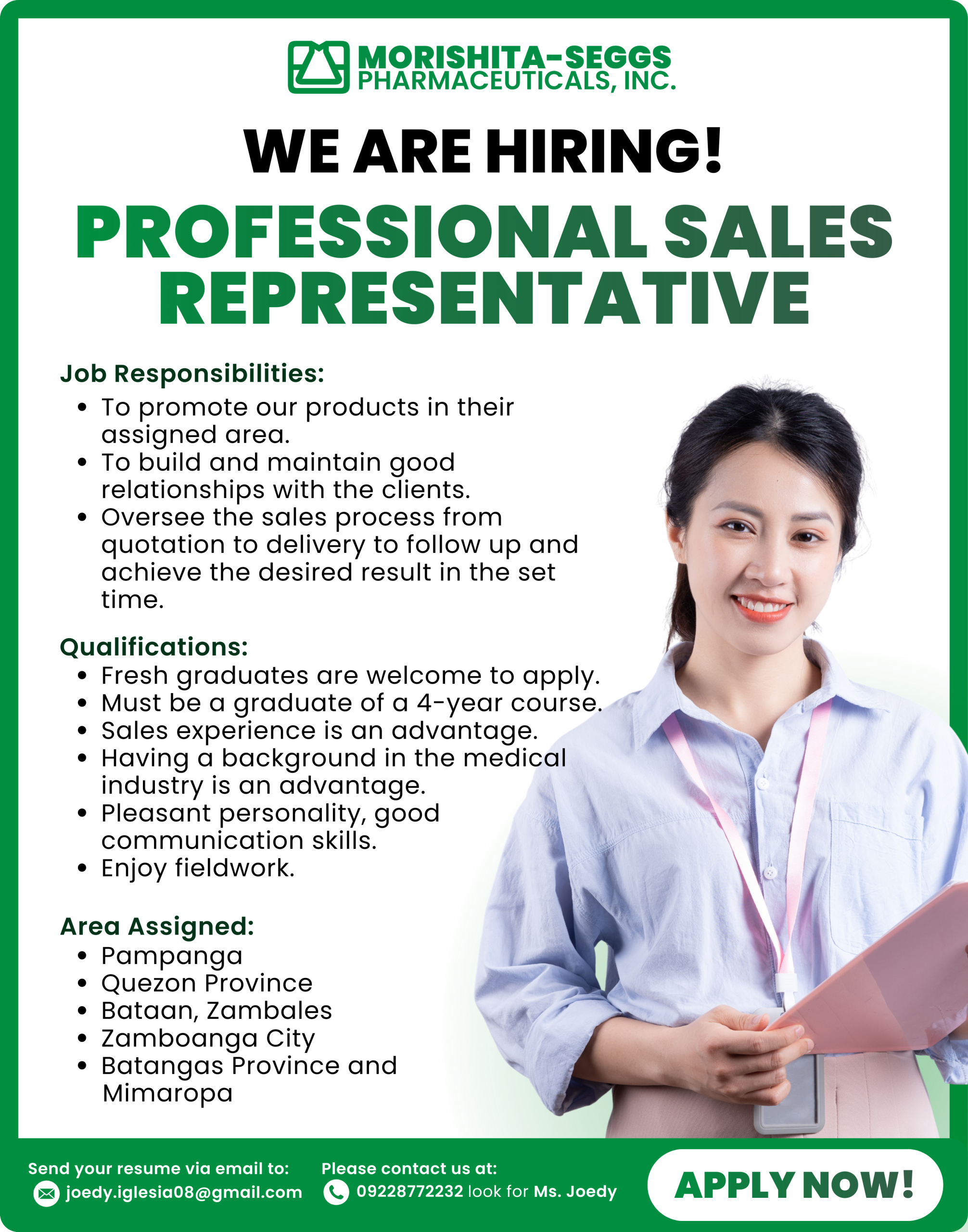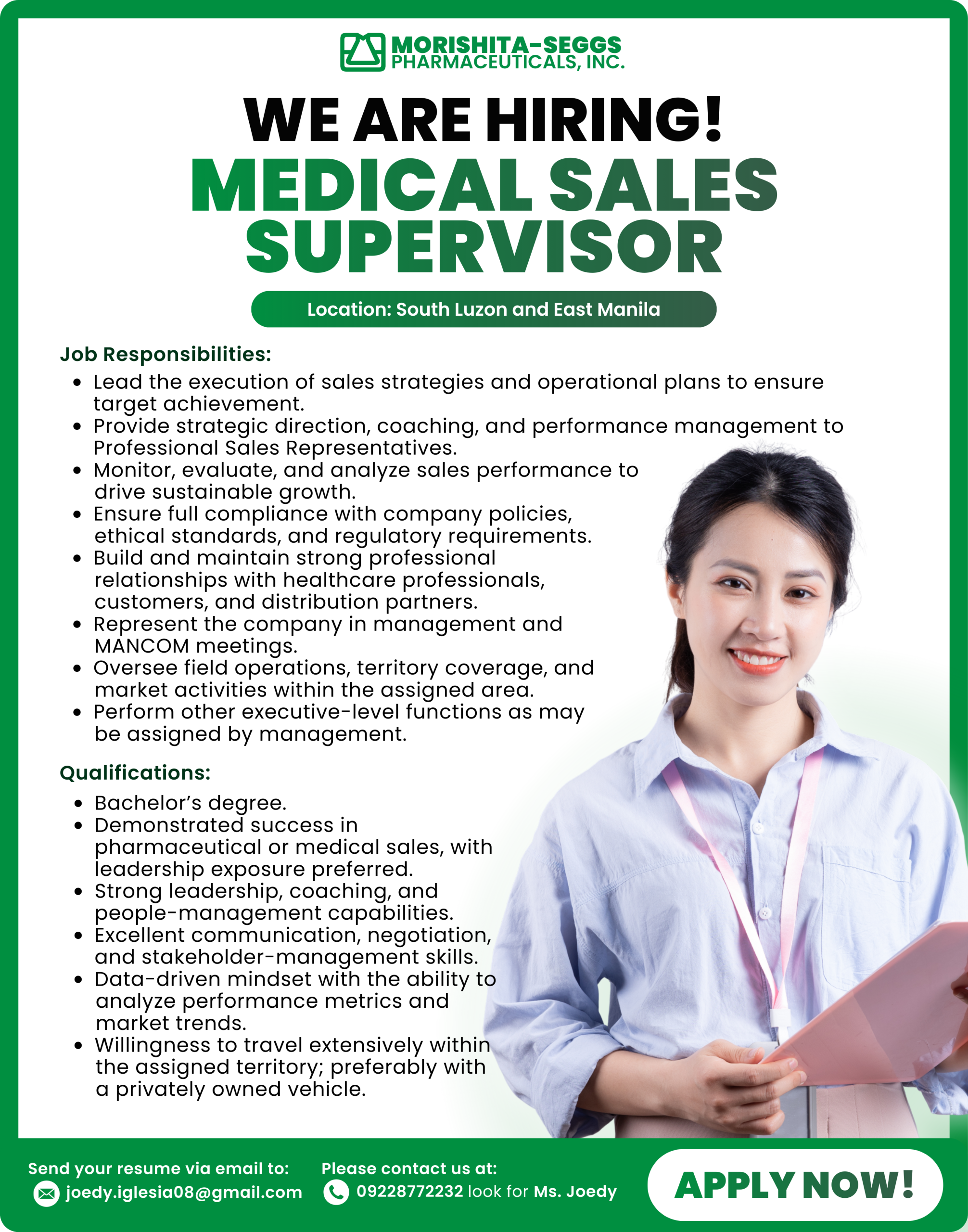 At Morishita Seggs, we always seek passionate, driven individuals to grow with us. If you’re ready to make a difference in healthcare and be part of a company that values innovation and integrity — we want to hear from you.